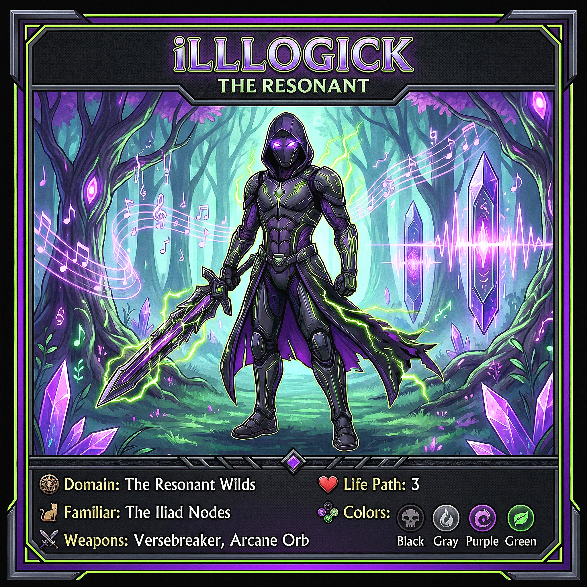 FIG 6.0: The working placeholder data card for iLLLogick (The Catalyst), displaying his designated arsenal (Versebreaker & The Arcane Orb of Resonance) and his familiar (The Iliad Nodes) within The Resonant Wilds.